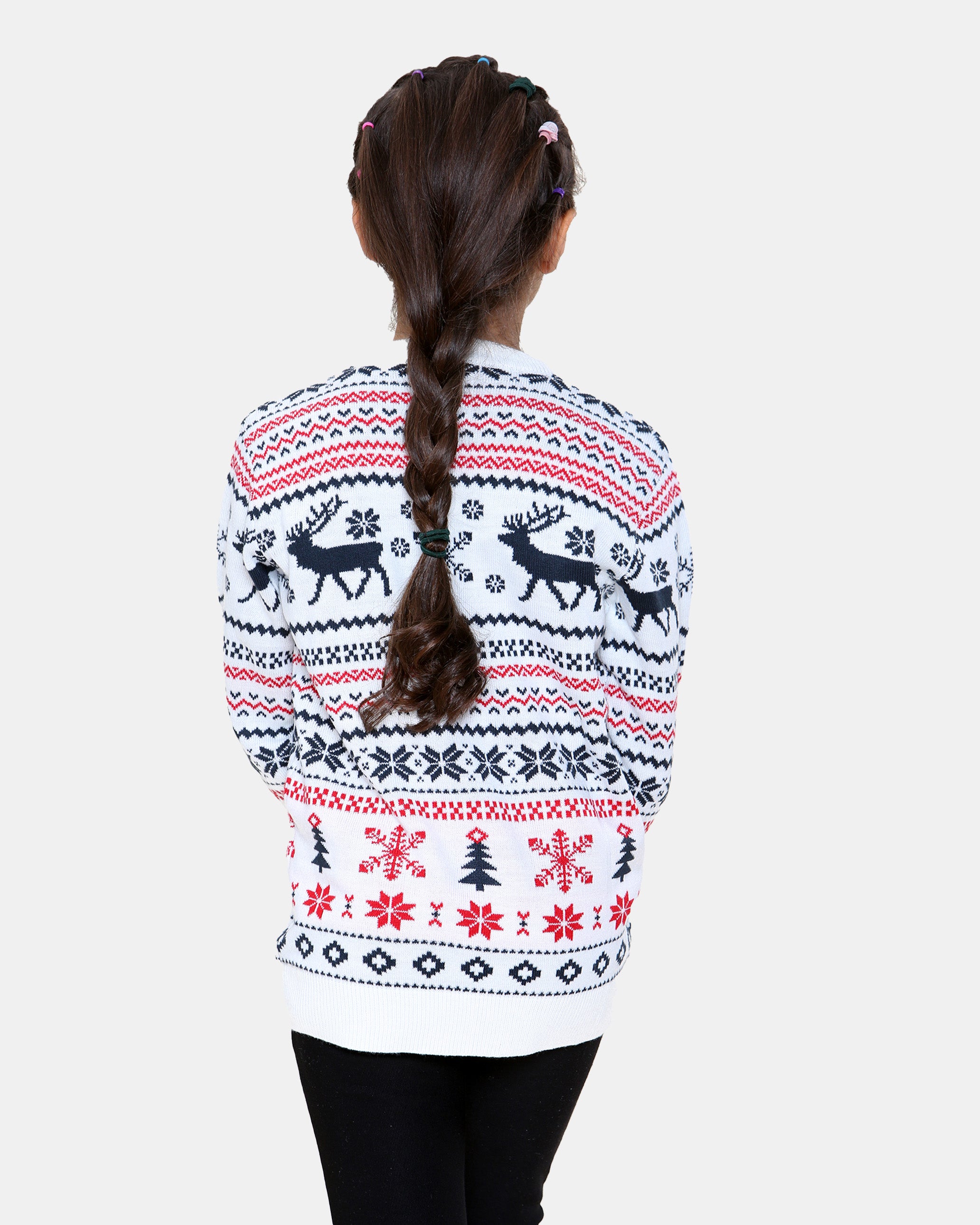 Add festive charm with this cream Fairisle reindeer jumper. Featuring a traditional reindeer and snowflake knit pattern, it’s a cosy classic for school, parties or family gatherings. Made from soft acrylic, it keeps kids warm and comfy while bringing timeless Christmas style.