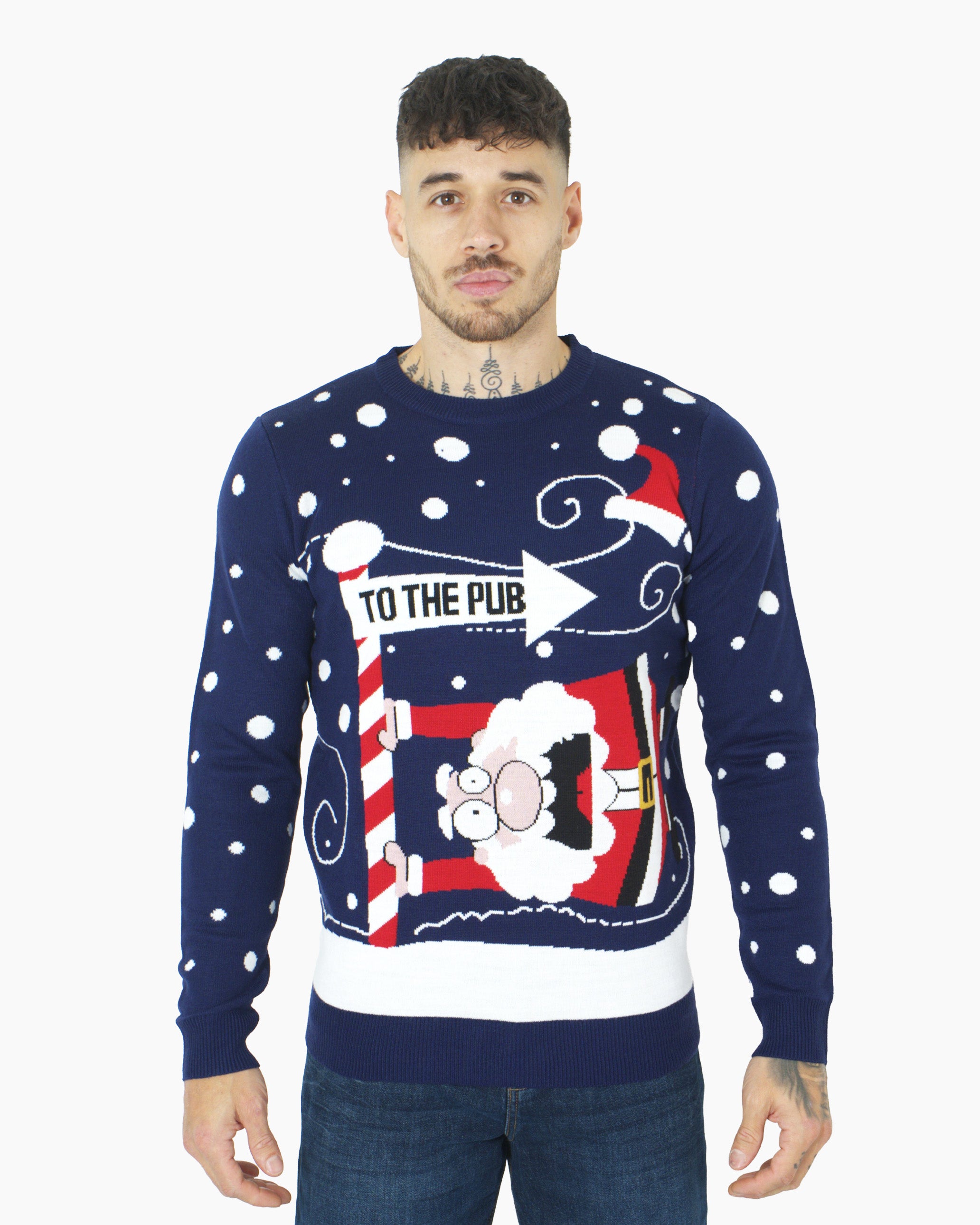 Celebrate the season with humour and charm in this navy “Santa To the Pub” jumper by NOROZE. Featuring a festive tree and playful slogan, this cosy knit is your go-to choice for spreading cheer at parties, pubs, or simply staying warm with seasonal flair.