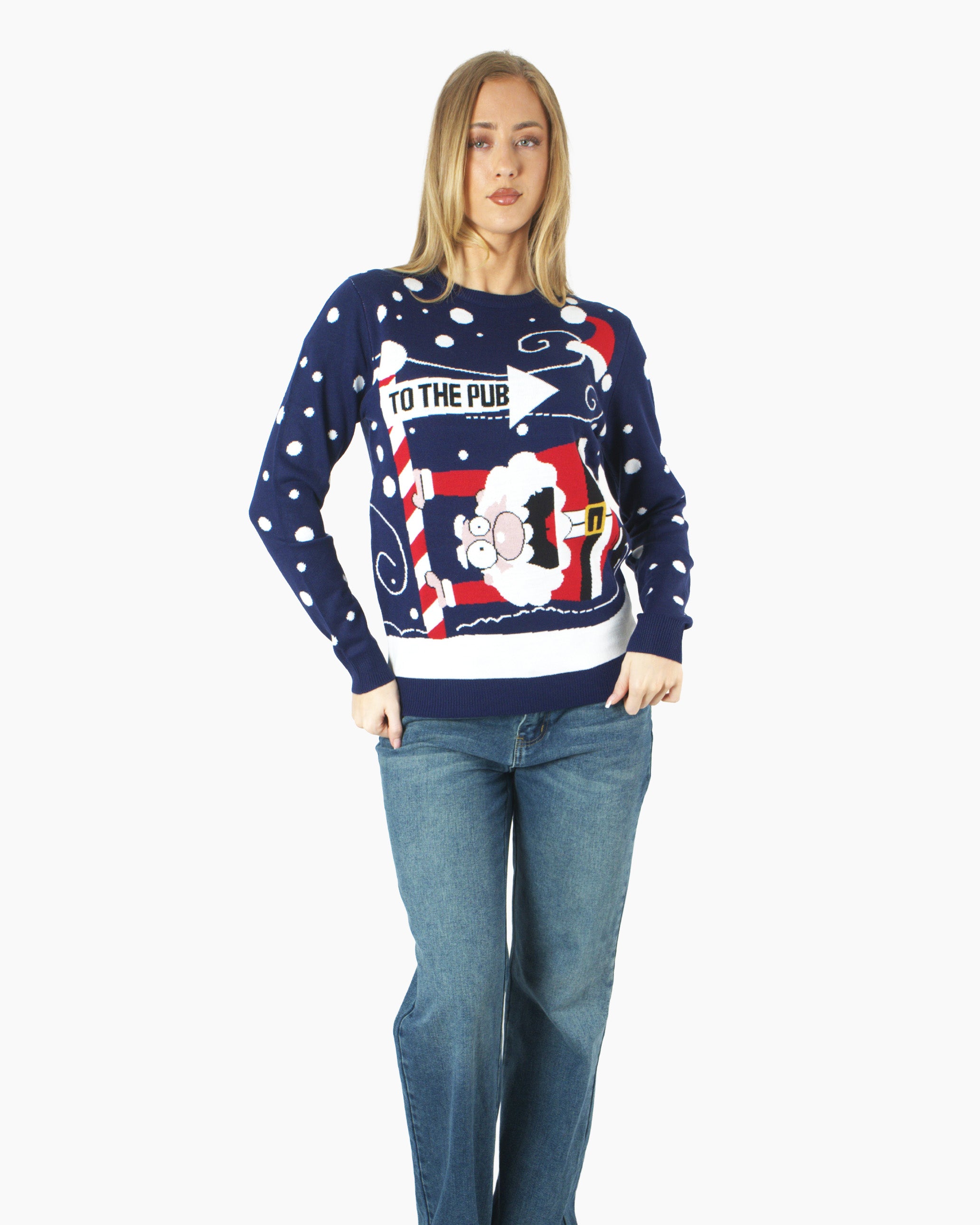 Celebrate the season with humour and charm in this navy “Santa To the Pub” jumper by NOROZE. Featuring a festive tree and playful slogan, this cosy knit is your go-to choice for spreading cheer at parties, pubs, or simply staying warm with seasonal flair.